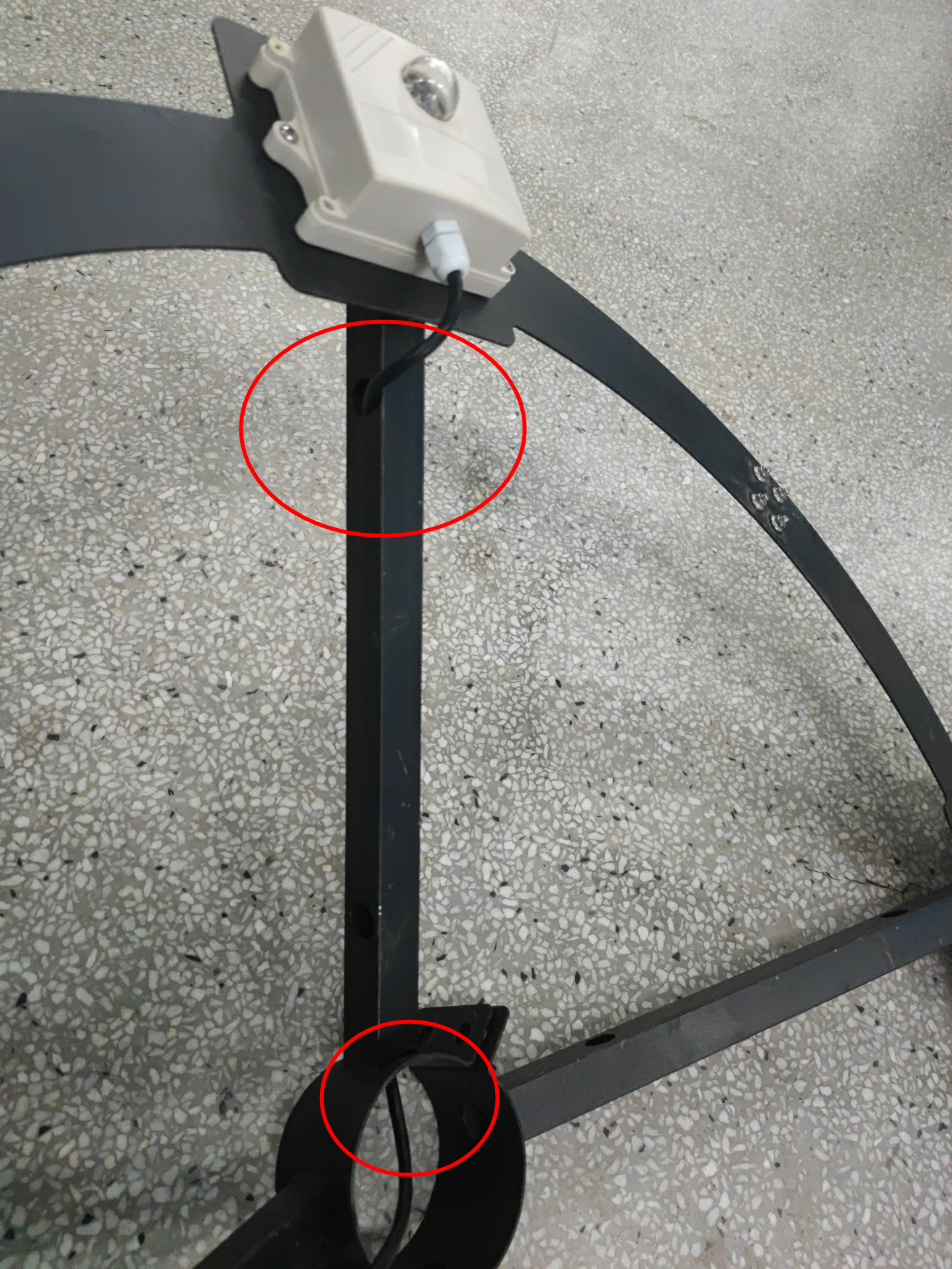 13、安裝固定圓盤支架并穿線,先將圓盤支架中間四個(gè)螺絲拆卸,然后將圓盤支架從燈桿上方套到燈桿上,光照傳感器朝向控制箱方向,將傳感器線從對(duì)應(yīng)的進(jìn)線孔(距燈桿頂端1m)穿進(jìn)燈桿,從控制箱的出線孔(離燈桿底座1.2m)穿出燈桿,最后將圓盤支架4個(gè)穿線孔與燈桿的4個(gè)進(jìn)線孔對(duì)齊,固定4個(gè)螺絲并擰緊,注意不要壓到線