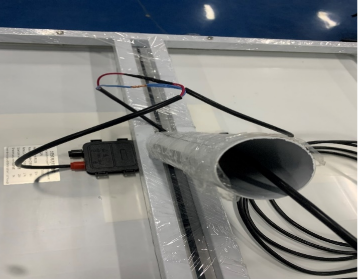 10、電池板接線,注意紅線為正極、黑(藍(lán))線為負(fù)極,兩塊電池板并聯(lián)接到延長(zhǎng)線上